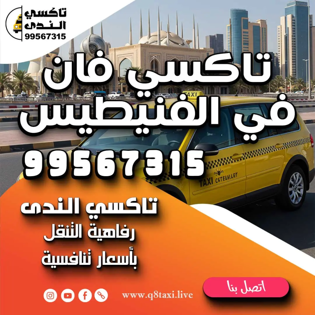 هذا المقال هو دليلك لاستكشاف أهمية توفر تاكسي فان في الفنيطيس، مزايا اختيار هذا النوع من المركبات للرحلات المتعلقة بطبيعة الفنيطيس العائلية والساحلية، وكيف يضمن تاكسي الندى توفير هذا الحل المناسب لك بكل سهولة وموثوقية، ليس فقط داخل الفنيطيس، بل ليربطها بكافة محافظات الكويت الست: العاصمة، حولي، الفروانية، الأحمدي، الجهراء، ومبارك الكبير، مقدماً لك الراحة والكفاءة التي تحتاجها في أي رحلة تتطلب مساحة إضافية.